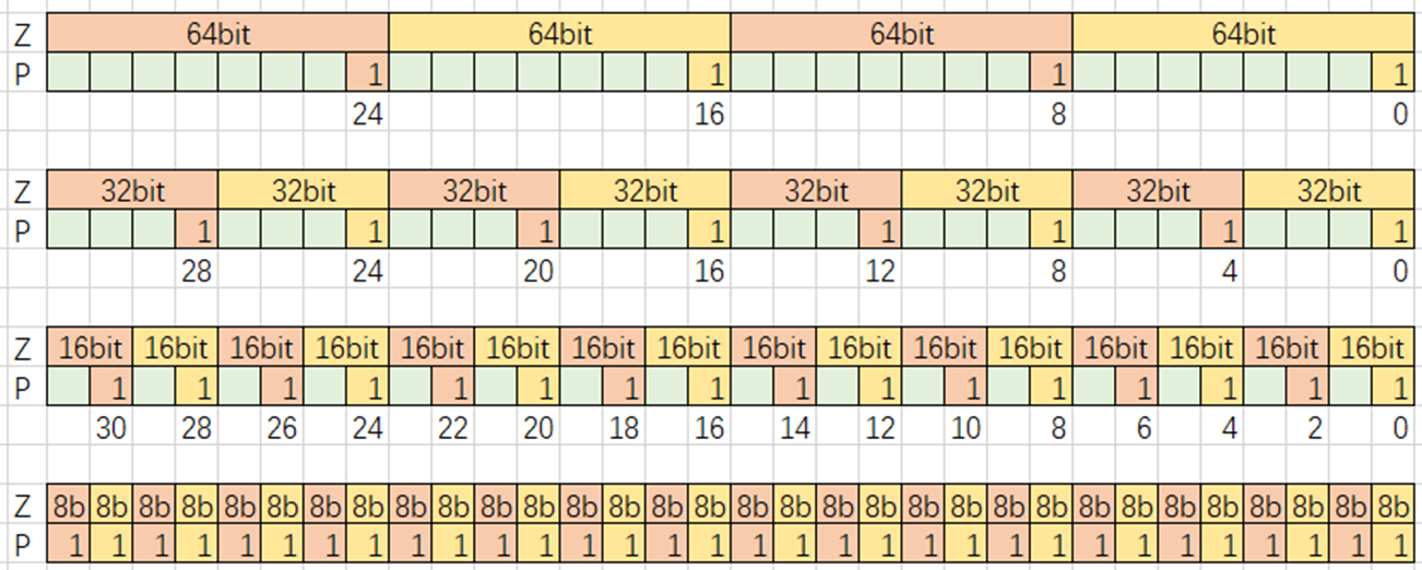 - 64位元素:Z寄存器容纳4个元素(256/32),因此P寄存器只有4位有效。