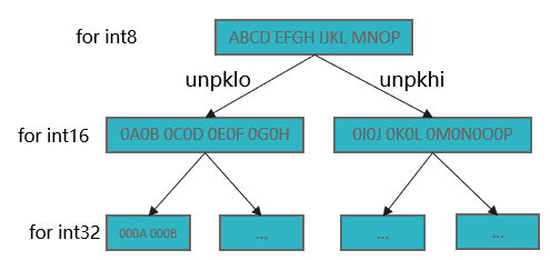 向量化场景下要进行循环展开,可以合并进行。如下图所示,32位的4个P寄存器的格式转换可以共用中间值,均摊了加载与第一层unpack,性能较优。