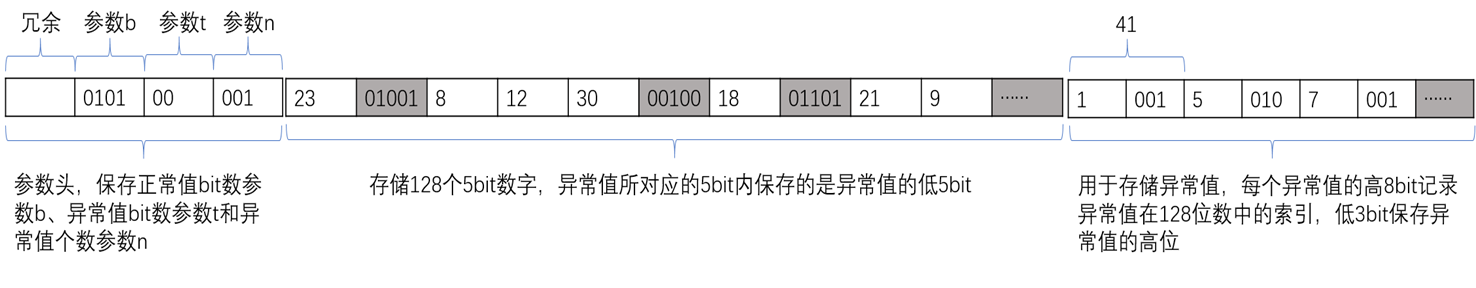 例如,对于数列23, 41, 8, 12, 30, 68, 18, 45, 21, 9,...,若确定b=5(即大部分数小于32),则正常值用5比特存储,异常值(如41, 68, 45)用32比特存储在末尾,并在正常值数组中记录异常值的位置偏移。