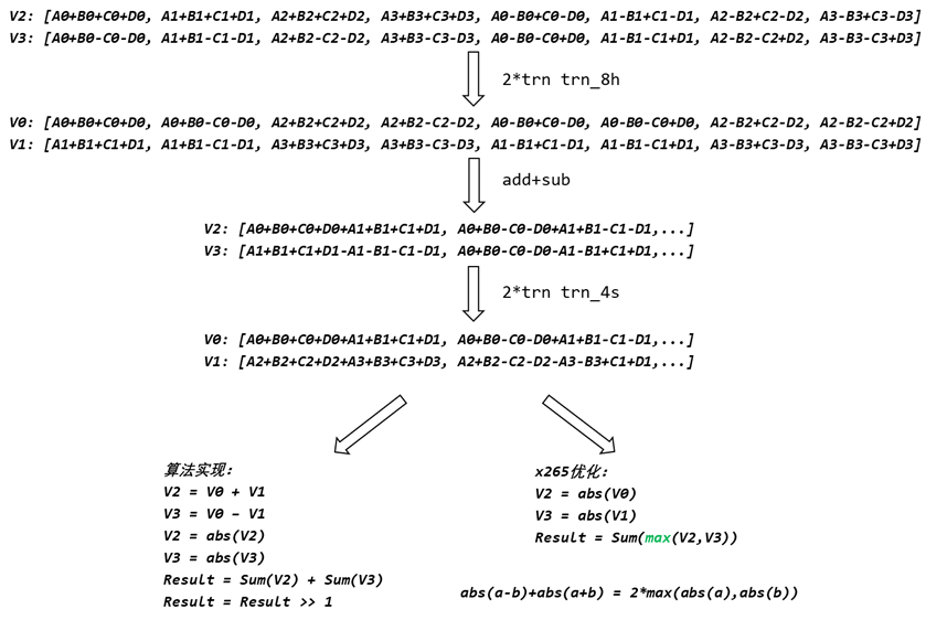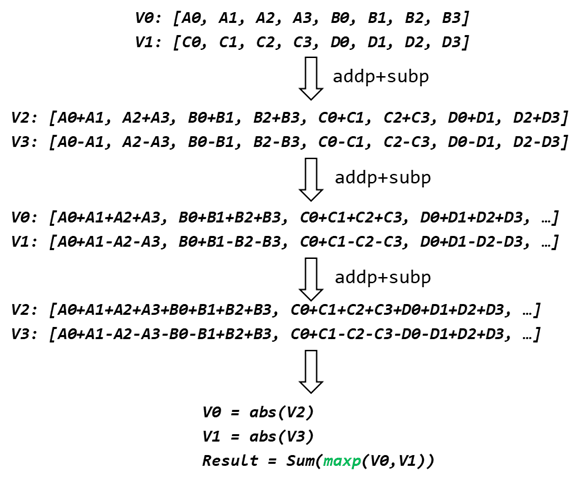 x265的当前实现问题在于引入较多TRN指令影响算子性能,观察可以发现,对于列hadamard的计算十分简单,因为所有参与计算的值都是在向量中对齐排列的,可以直接应用“垂直加减法“(即ADD和SUB指令)。