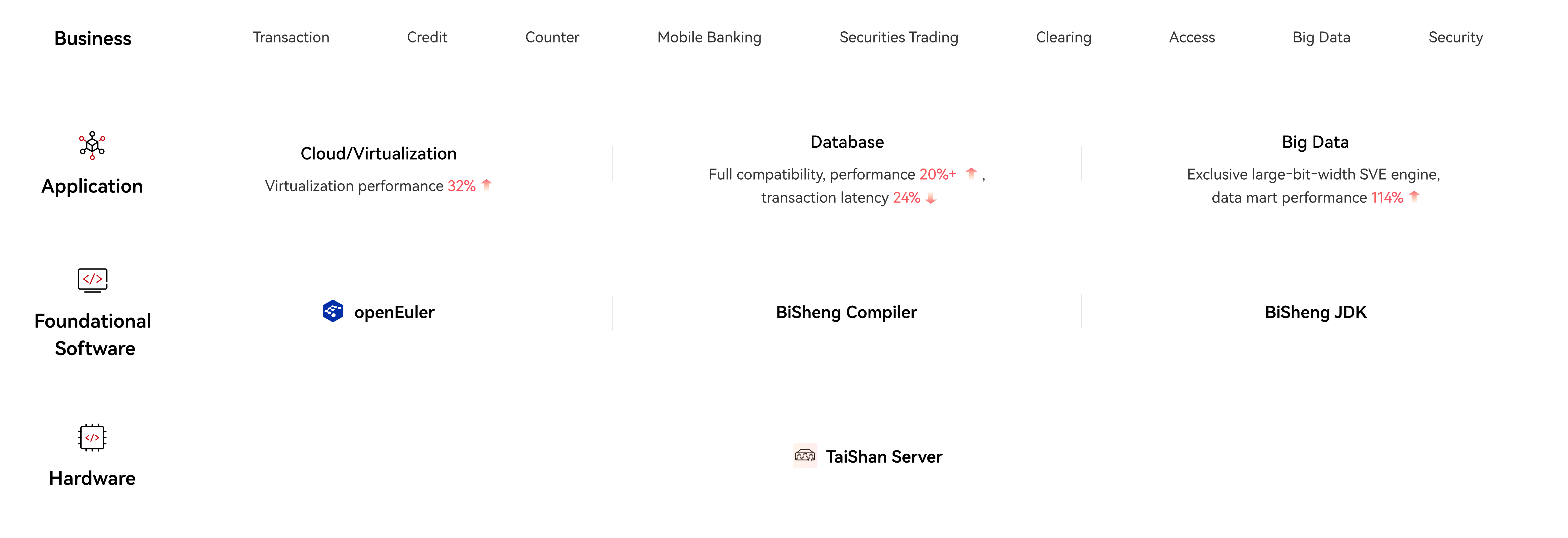 Core banking systems: Featuring high-performance multi-core architecture and enhanced RAS, TaiShan ensures the stability and constant availability of core banking systems. The DevKit enables rapid Java application migration within hours, with BiSheng JDK further optimizing throughput and latency.