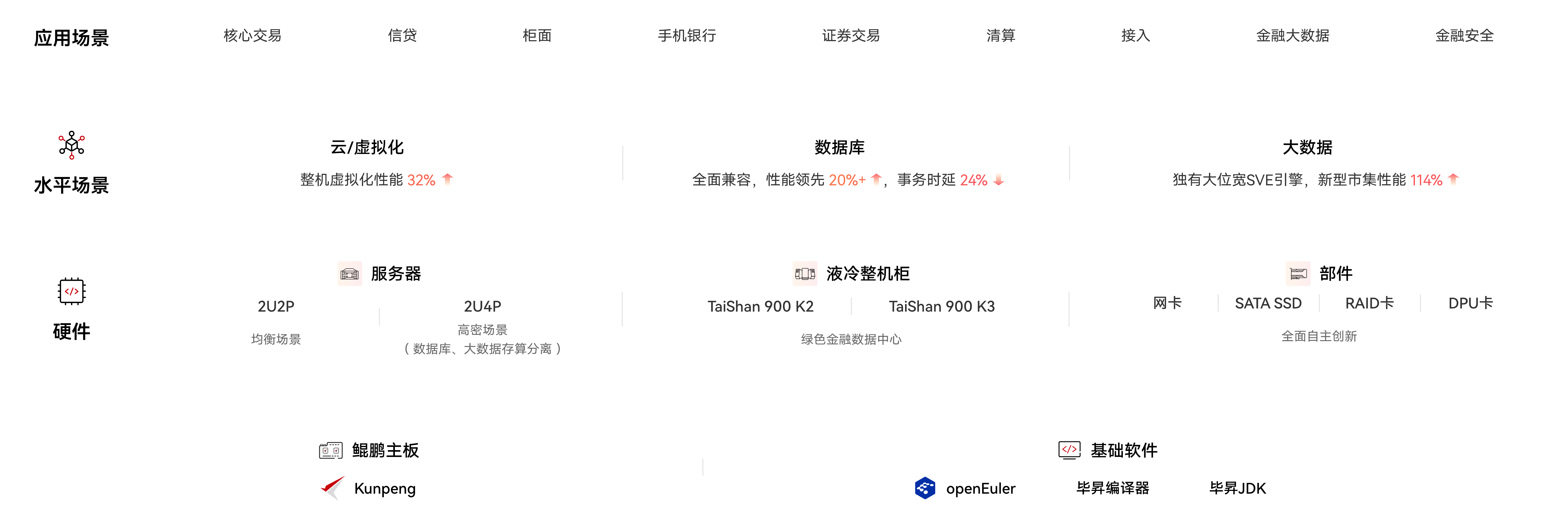 鲲鹏基于高性能处理器与软硬协同能力,为银行、证券、保险等金融机构提供高性能、高安全、开放易用的解决方案: